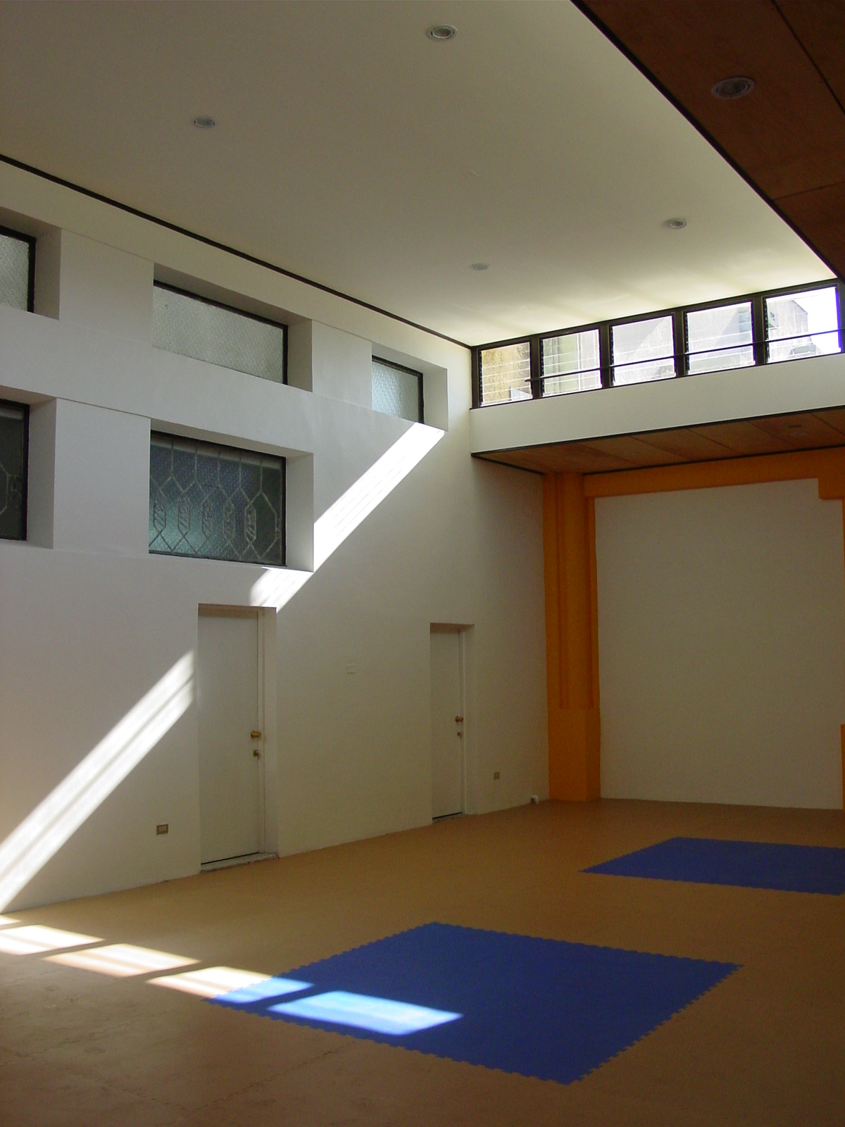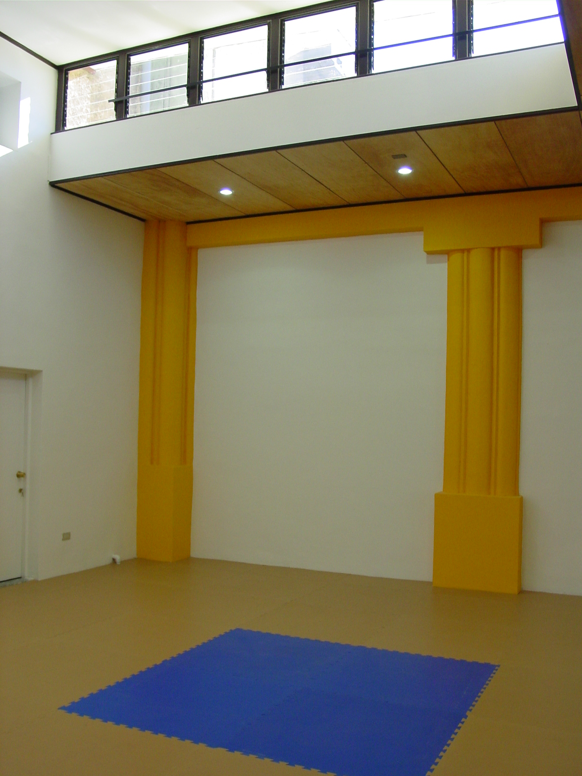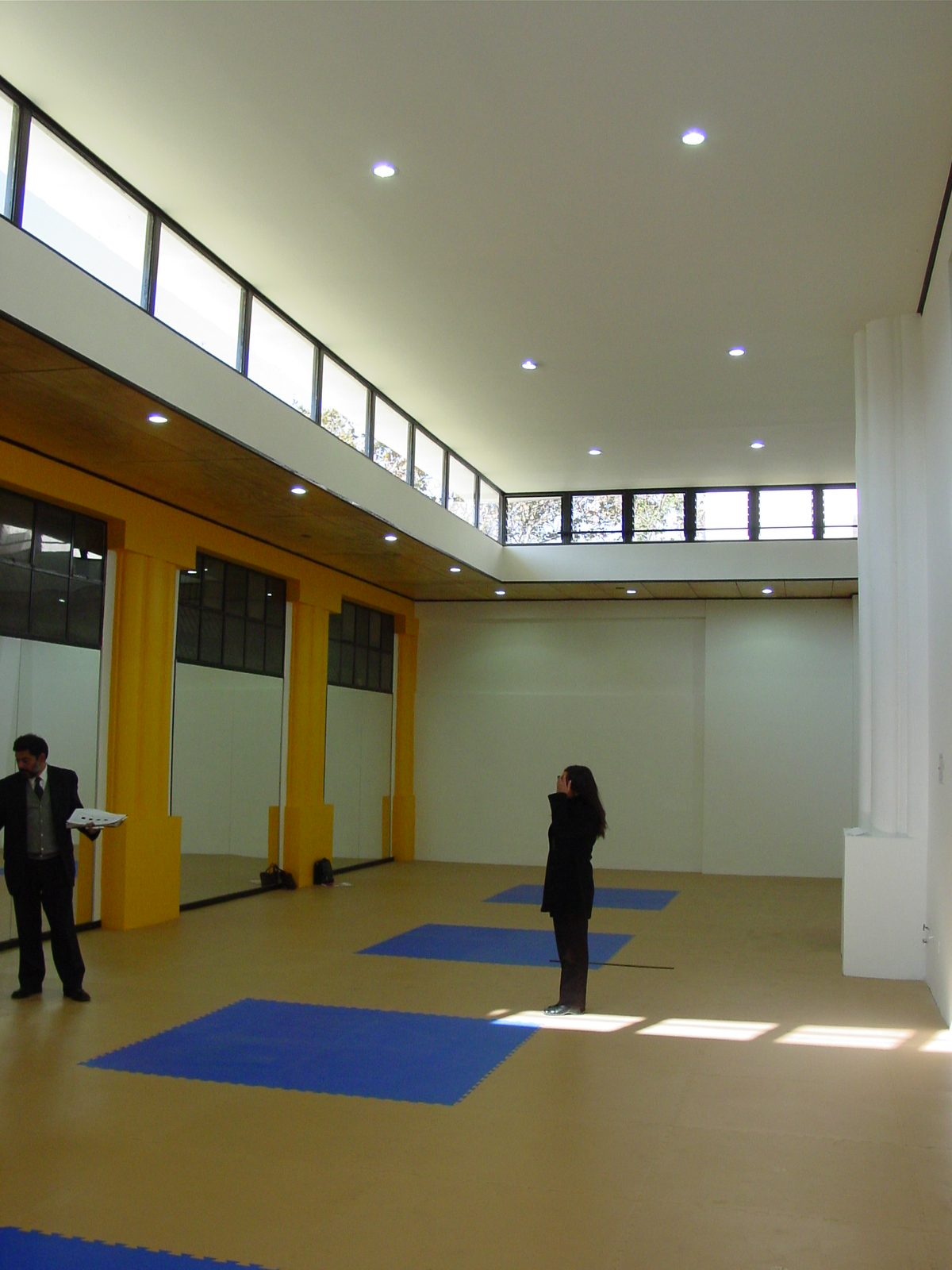 “Sala de Máquinas para Acondicionamiento Físico” Piscina Escolar Universidad de Chile, Intervención en la obra de Luciano Kulczewski. Proyecto para recuperar el solárium original que se ubica en el ala oriente, en pésimas condiciones, sin uso definido y con el deterioro generado por el adosamiento de la pérgola de las flores, que se ubica adyacente al edificio y que en el proyecto original se proyectaba a la plaza hoy intervenida por locales comerciales de la pérgola. Fondo Chiledeportes con recomendación técnica de Mideplan. La idea es rescatar este espacio que quedo rodeado y sin visibilidad producto de la pérgola de las flores, perdiendo sus aperturas a la plaza y su iluminación. Ante esto se trabajó con los elementos arquitectónicos originales y la incorporación de una cubierta que potenciará la luz cenital y la amplitud del espacio, ganando una nueva área para la práctica deportiva. Equipo: Felipe Mieres U., Rodrigo Barros M. Luis Núñez A.