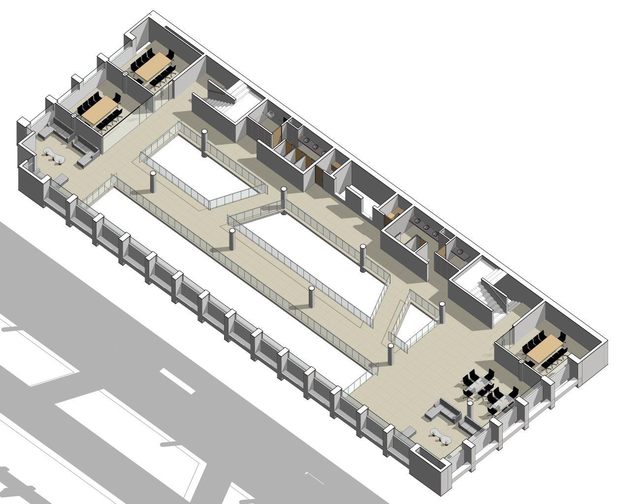 MURO: El primer elemento es el muro, como sostenedor de la composición global y como filtro hacia los predios colindantes. Se propone la generación de un medianero de servicio, funcional y recorrible en toda su altura y extensión, que da soporte a los distintos programas del edificio.